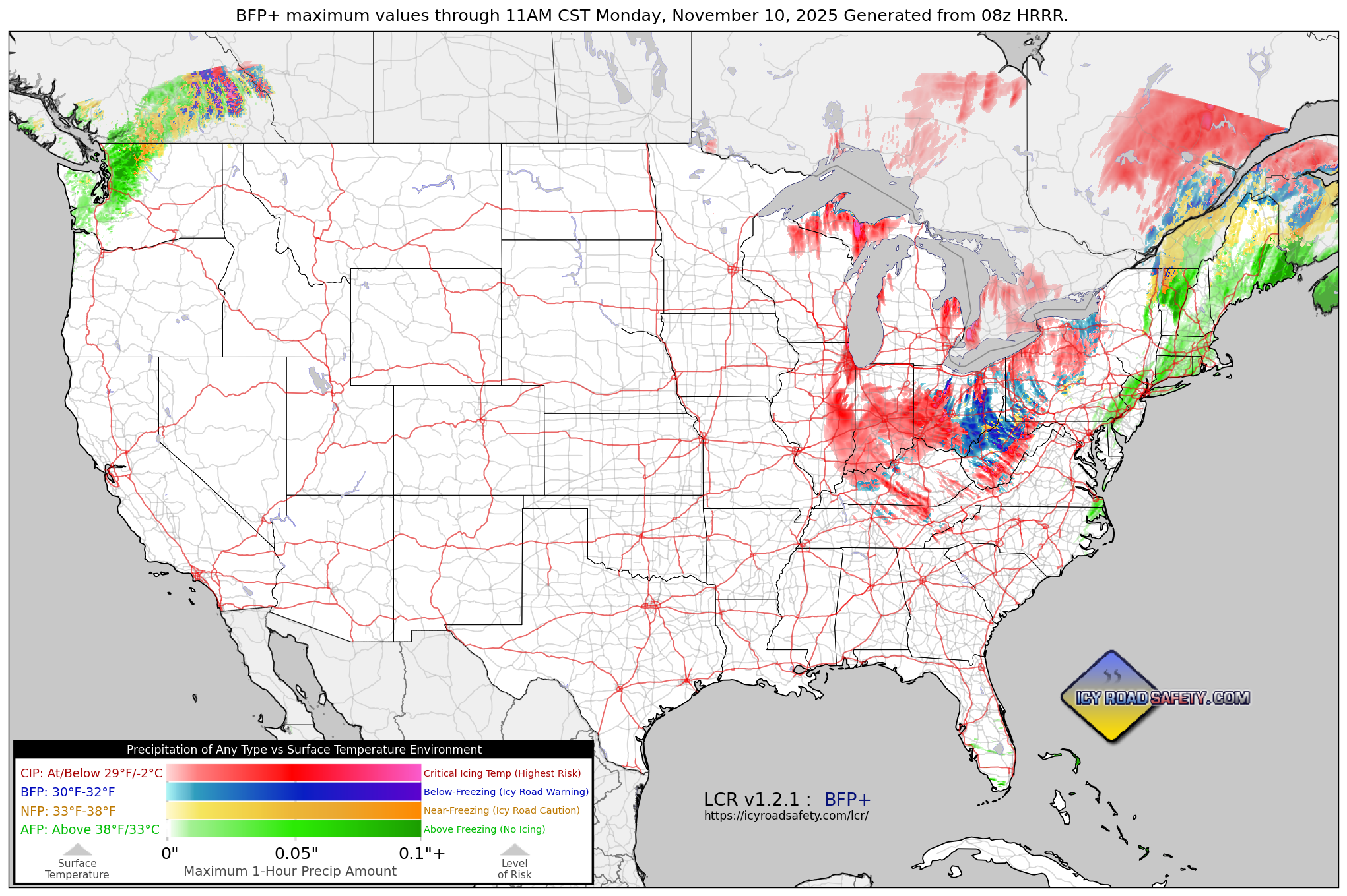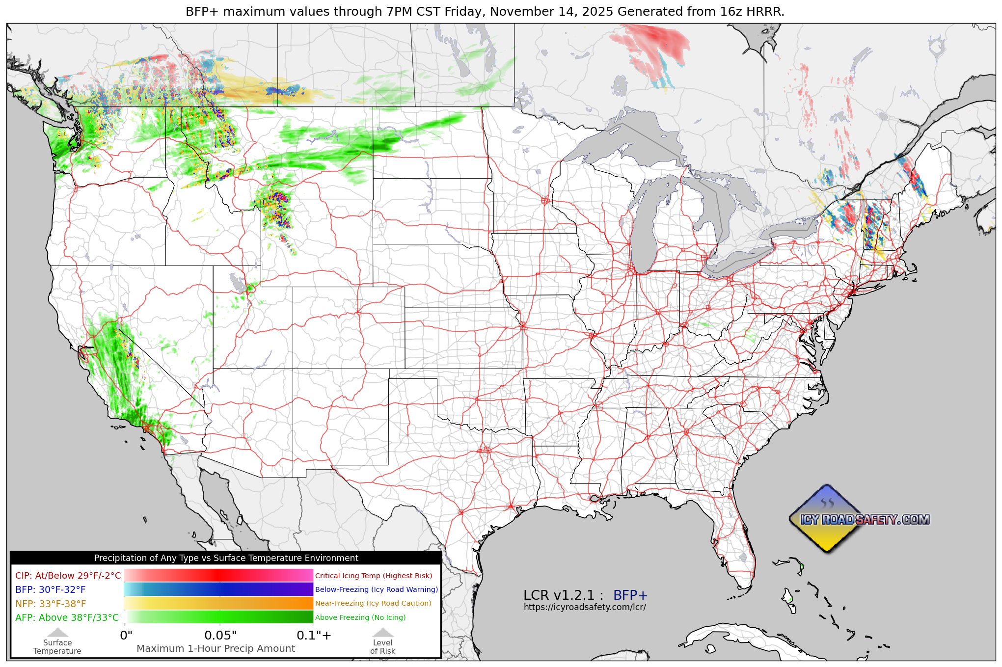 - Added BFP+ chart functionality: Version 1.2 of LCR creates the new BFP Plus data set. BFP+ is a bundle of four parameters, each with their own period maximum .nc file: CIP (Precipitation at/below Critical Icing Temperature), BFP (Below-Freezing Precipitation), NFP (Near-Freezing Precipitation) and AFP (Above-Freezing Precipitation). BFP-only charts can be plotted standalone in the same way previous versions. BFP+ charts are plotted by overlaying AFP (bottom layer), NFP (third layer), BFP (second layer) and CIP (top layer) using your data visualization ot mapping software of choice such as McIdas. Make sure you download the new BFP+ color scale files and apply each to their respective data set.