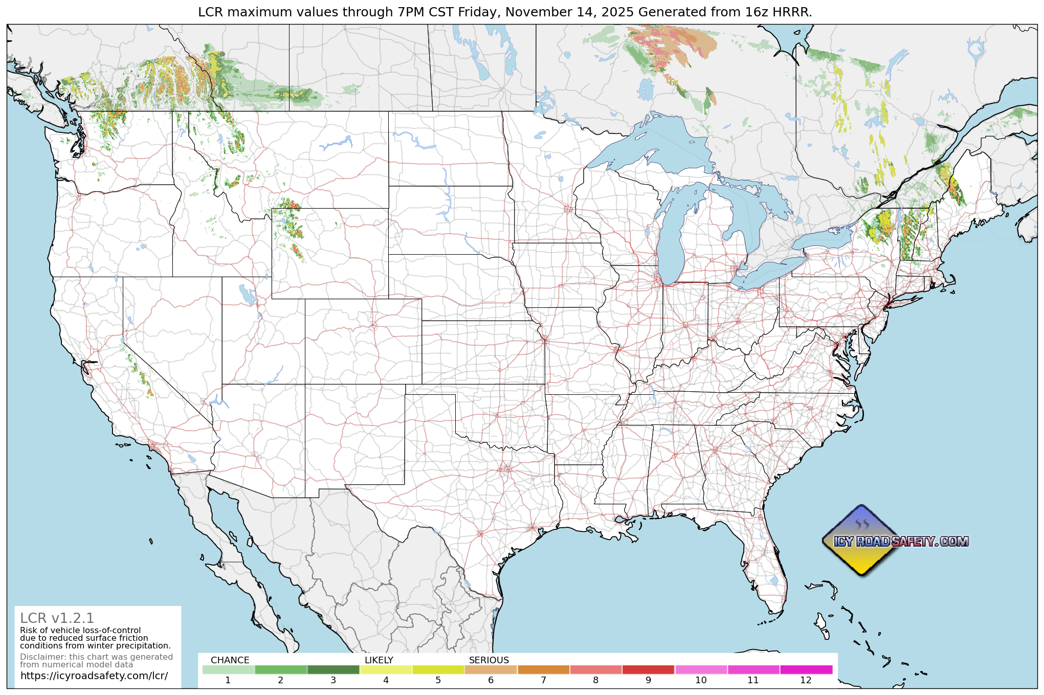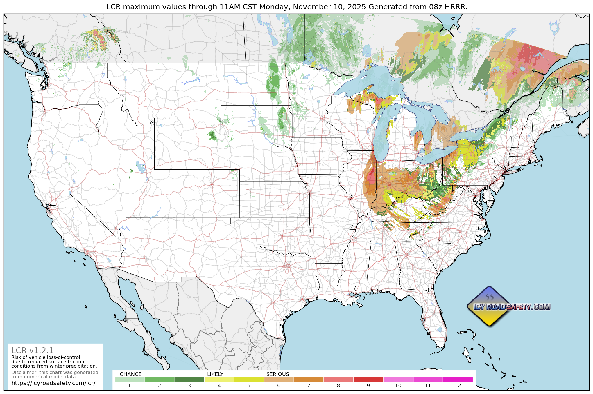 It is intended for LCR to be a complement, not a replacement, for other winter weather hazard assessment tools. The Winter Storm Severity Index, for example, is a product that consolidates ALL winter weather hazards such as extreme temperatures, travel impacts, property damage and power outages. LCR is a product that is focused solely on the danger to drivers losing control from a significant reduction in road surface friction.