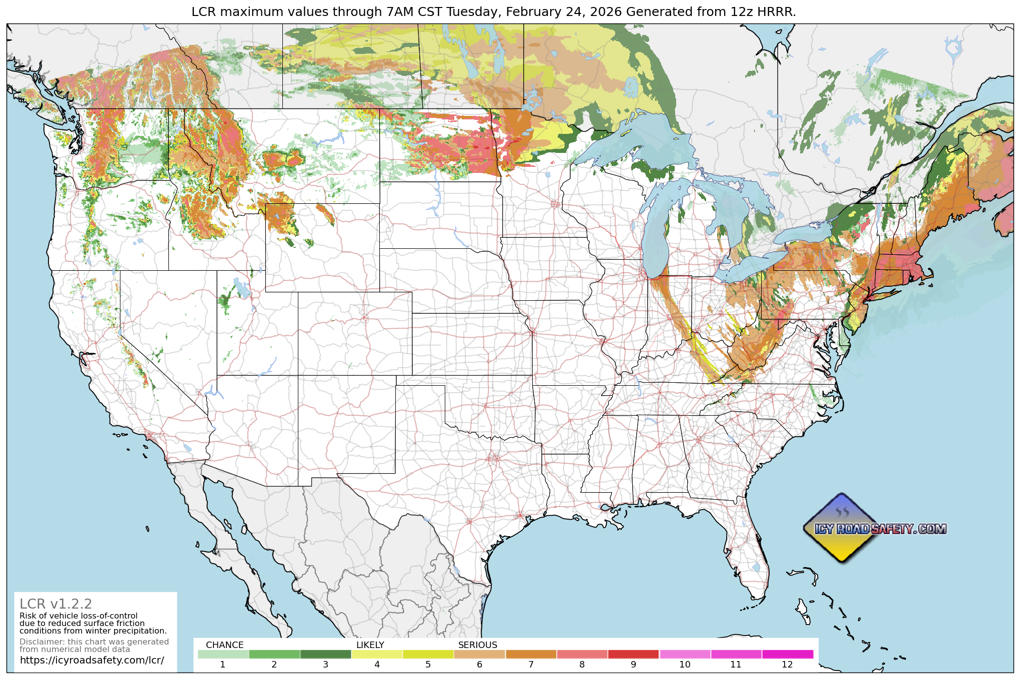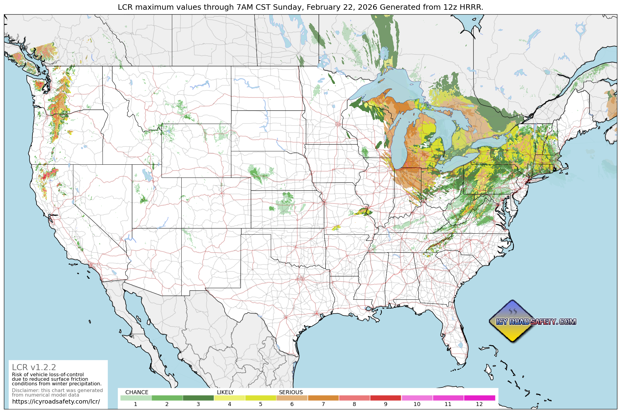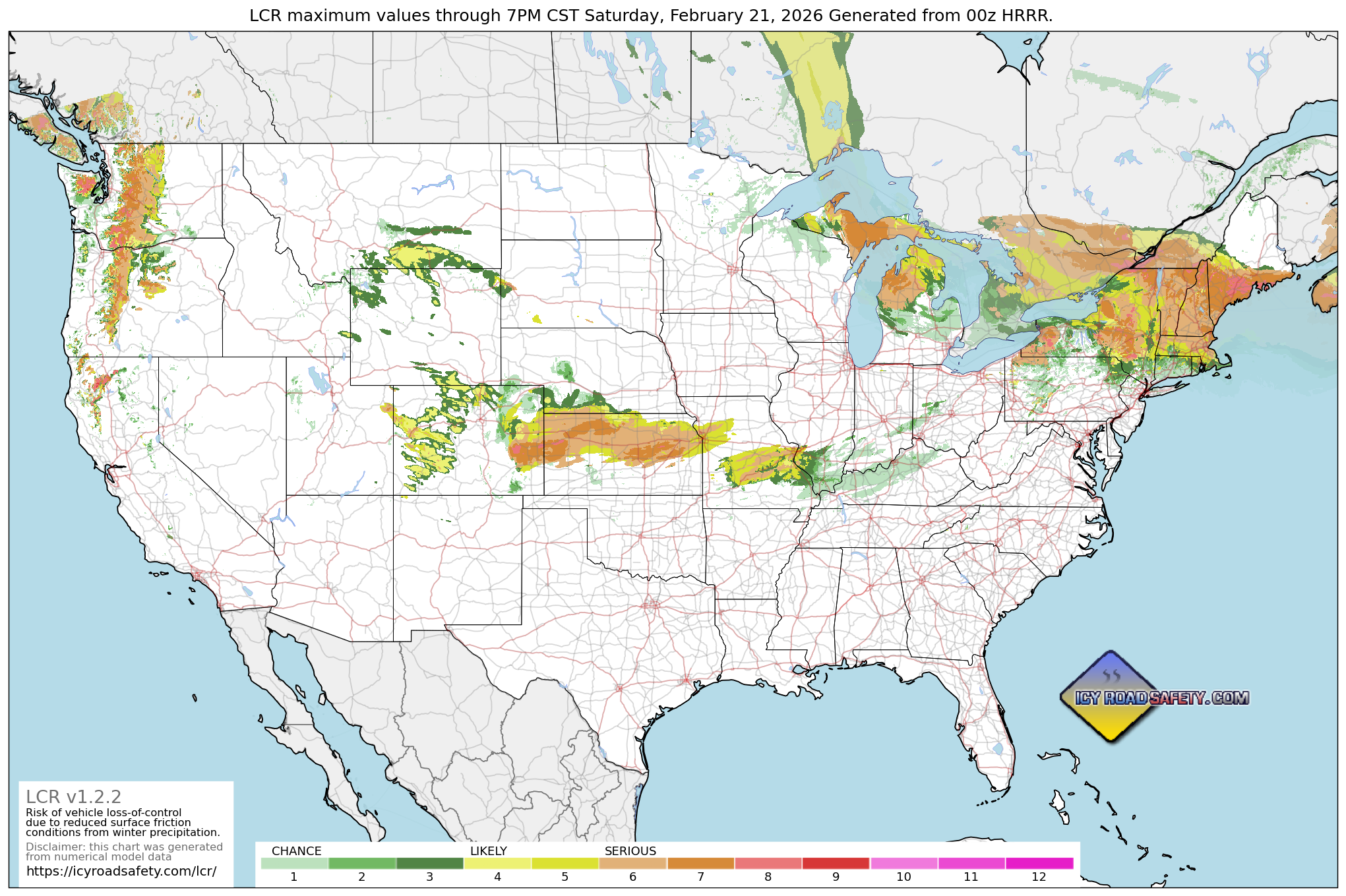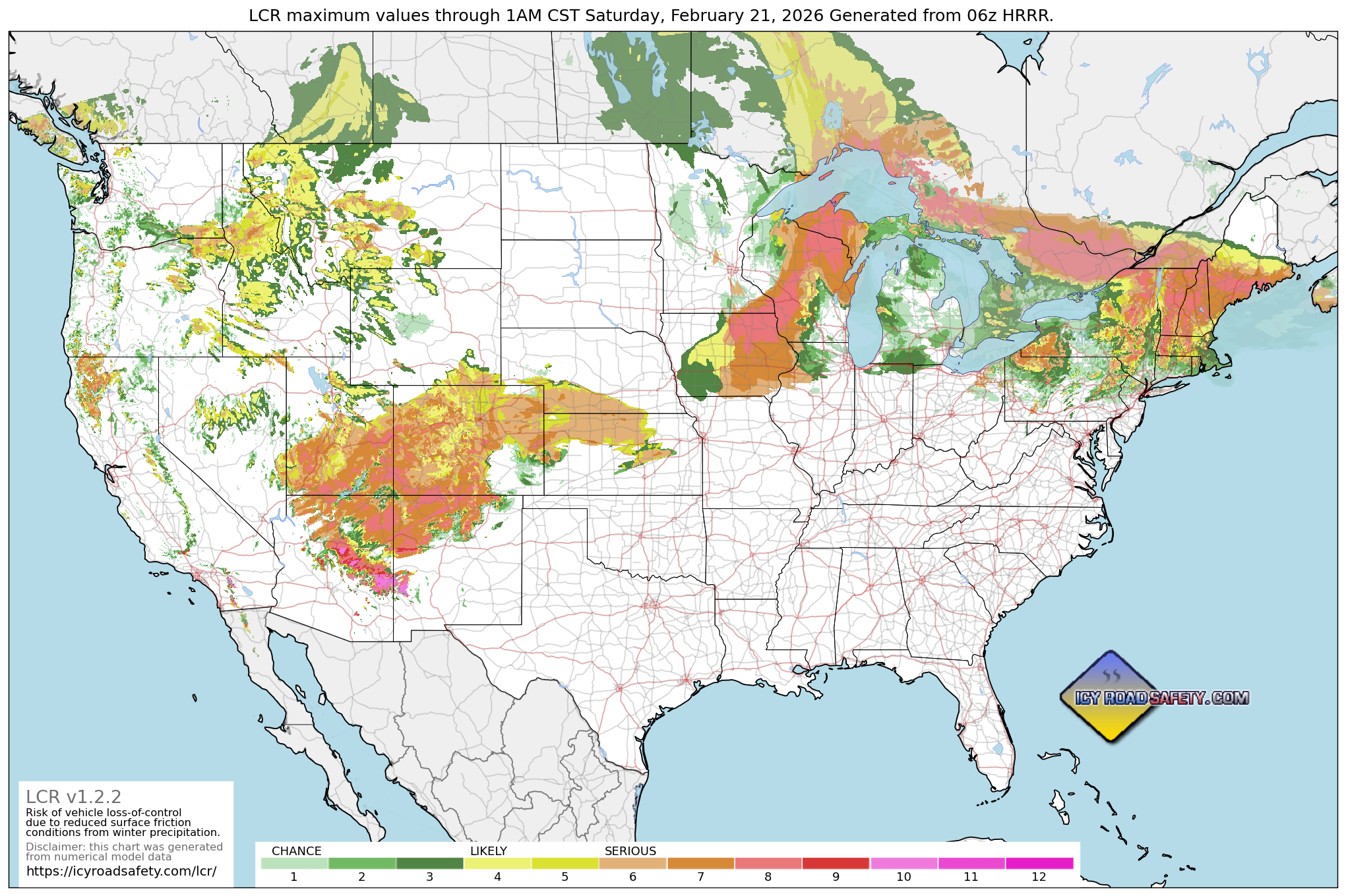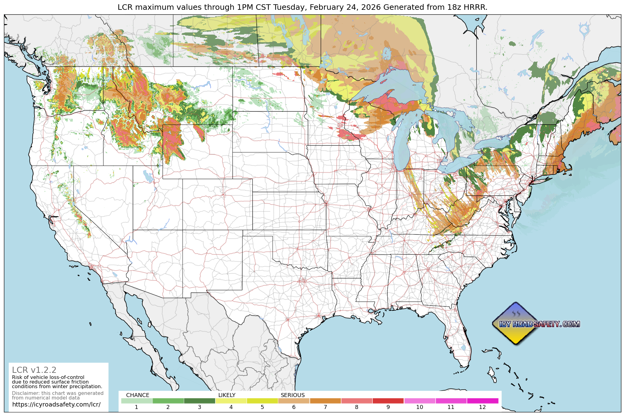 If your area is shown in a LCR risk area, it means the models are plotting conditions favorable for icy roads if the forecasted precipitation actually does occur.