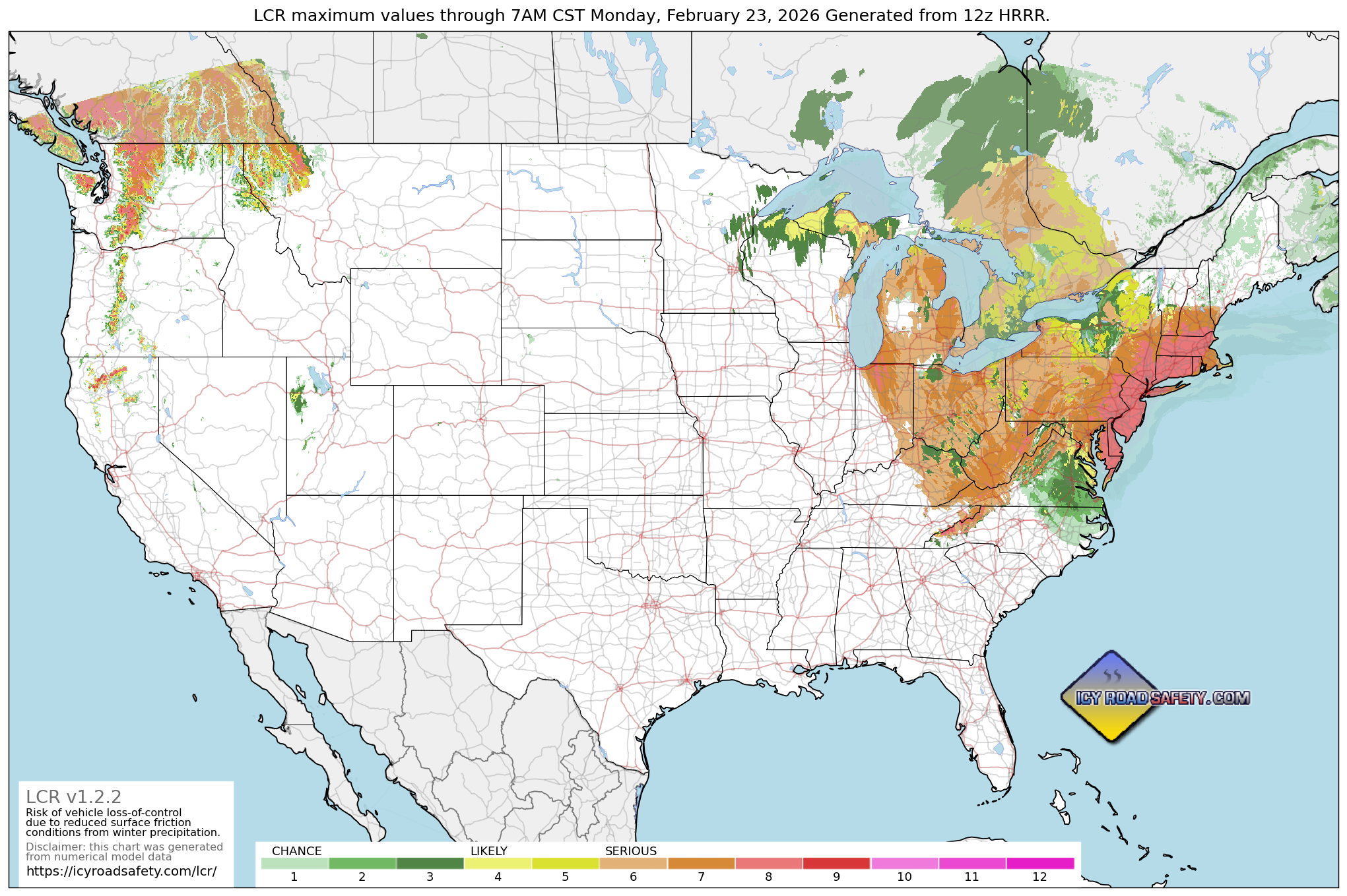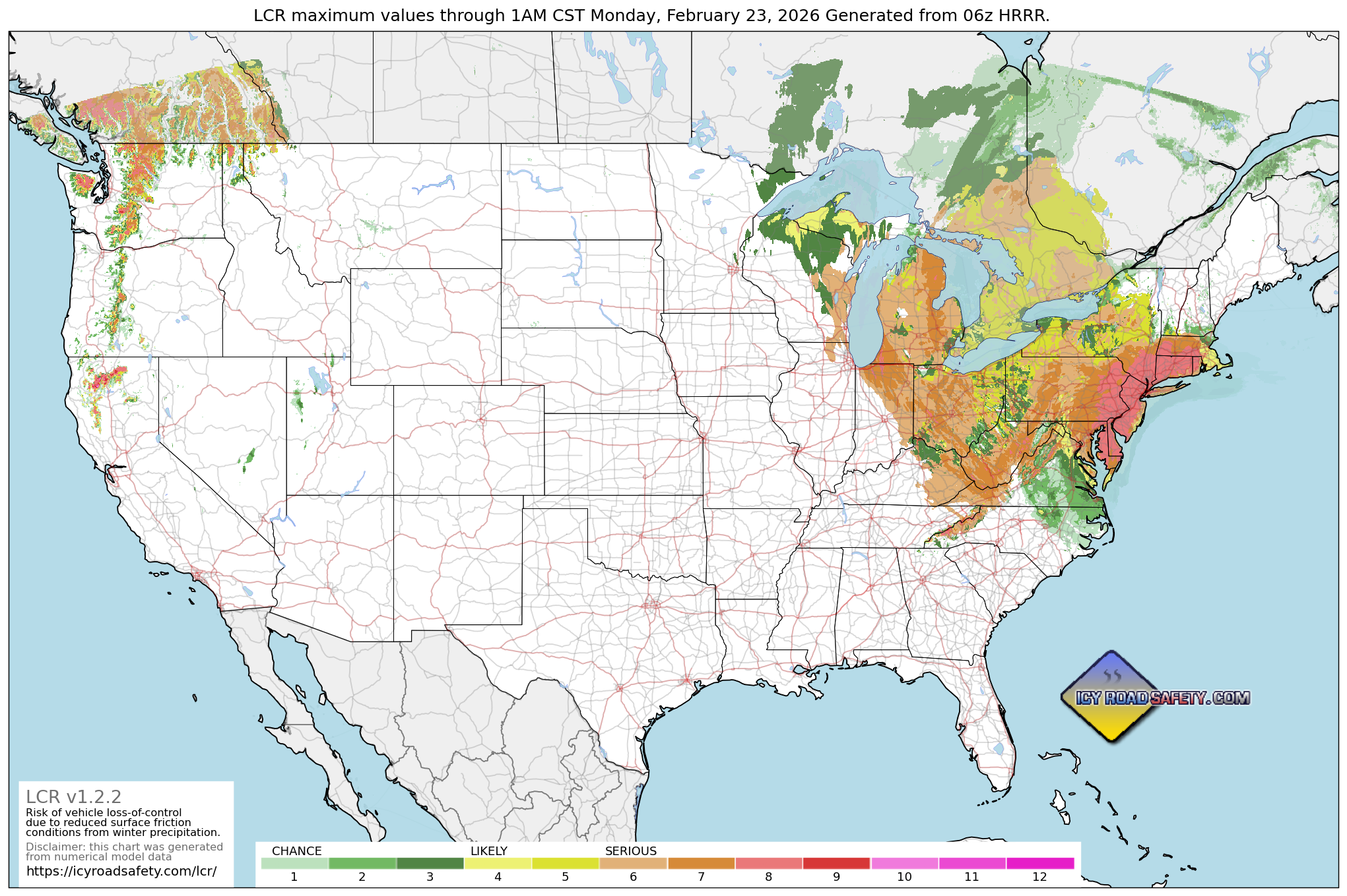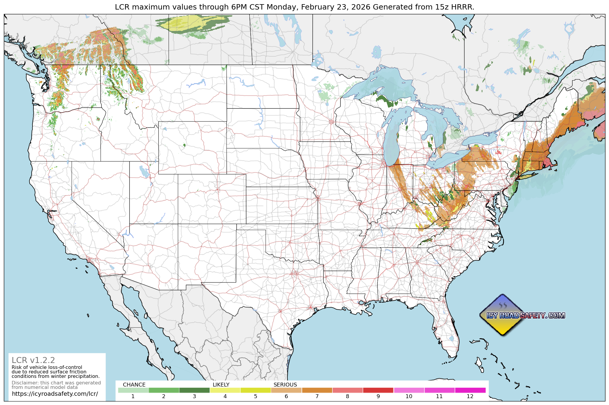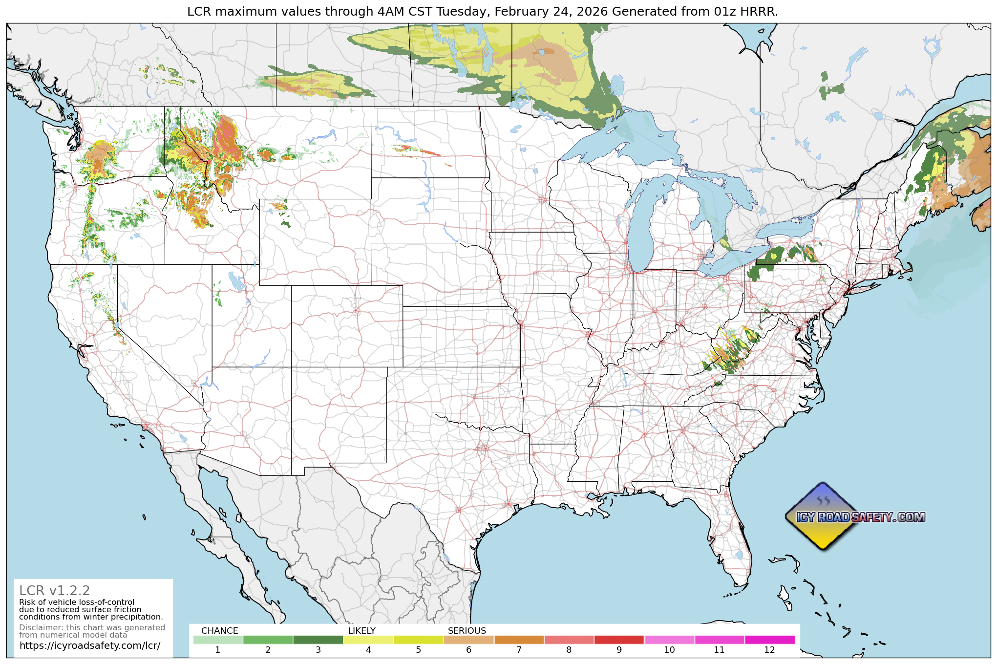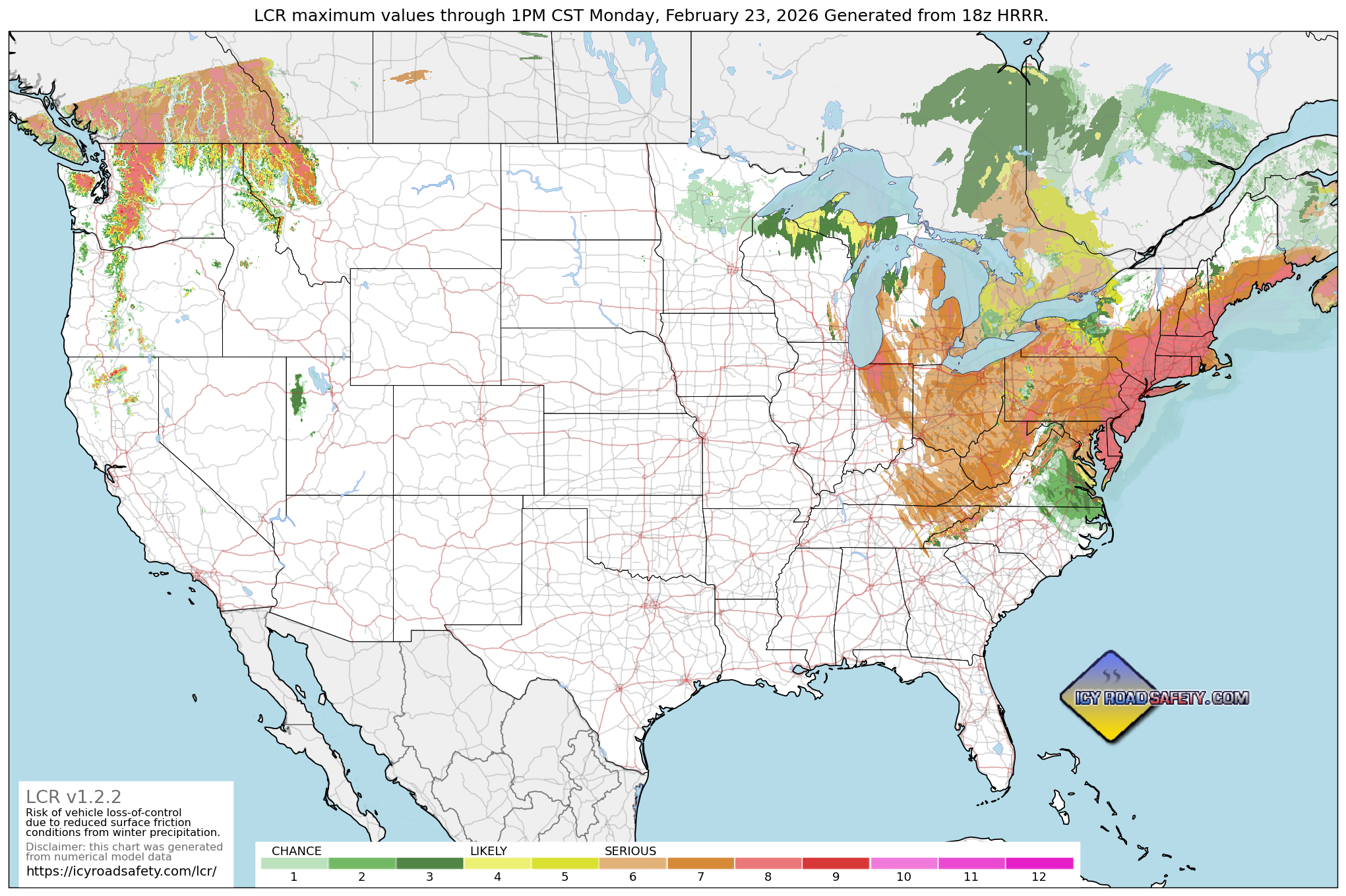 If your area is shown in a LCR risk area, it means the models are plotting conditions favorable for icy roads if the forecasted precipitation actually does occur.