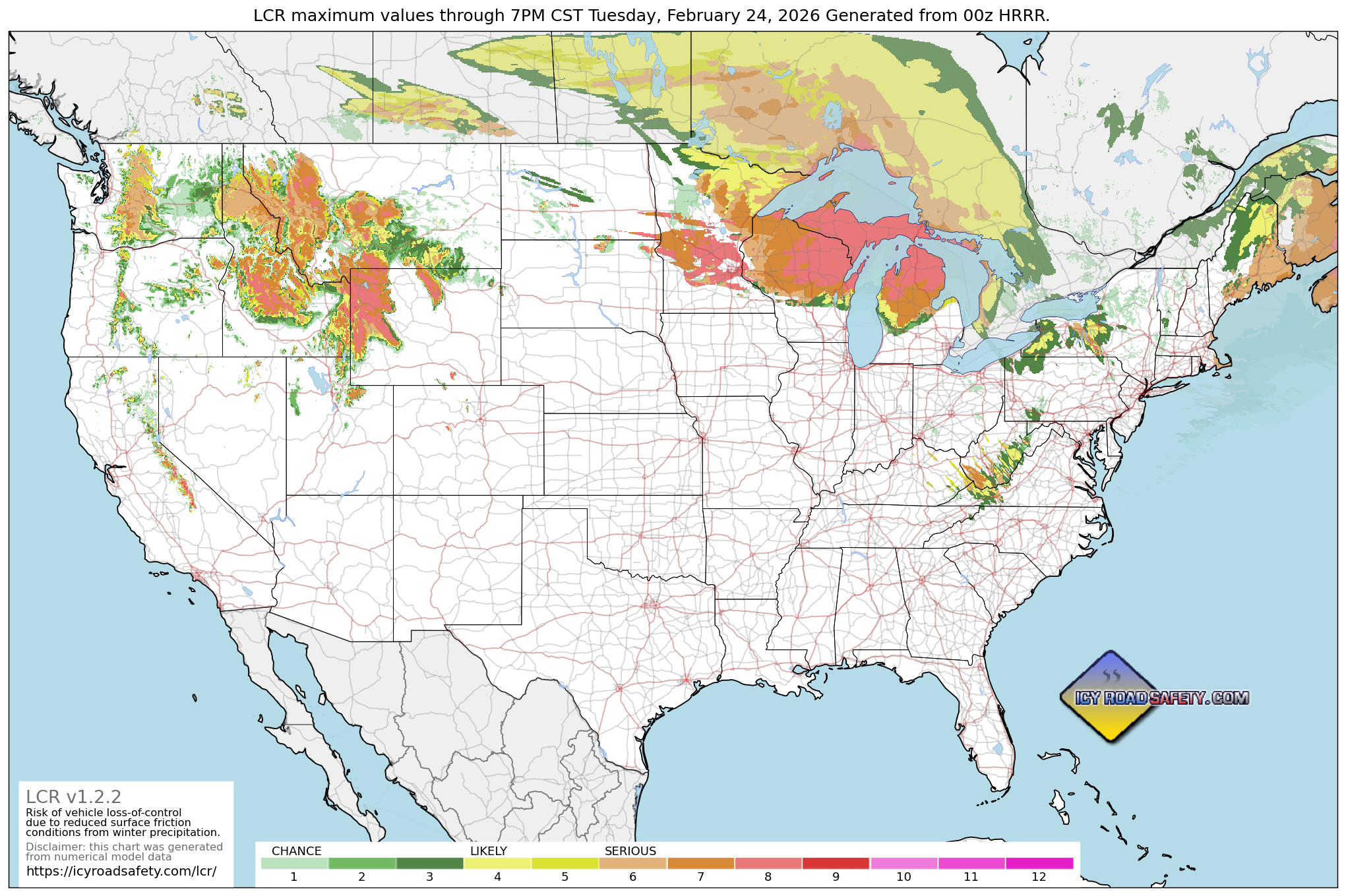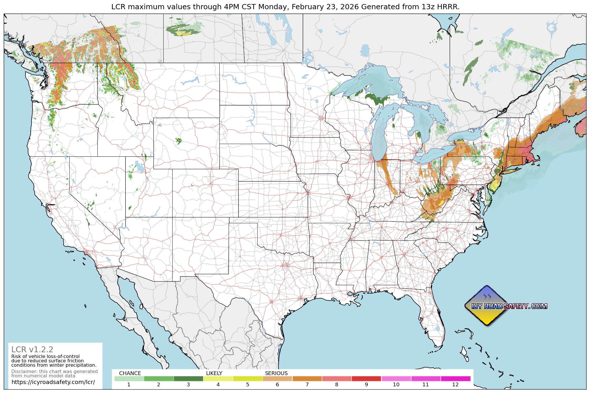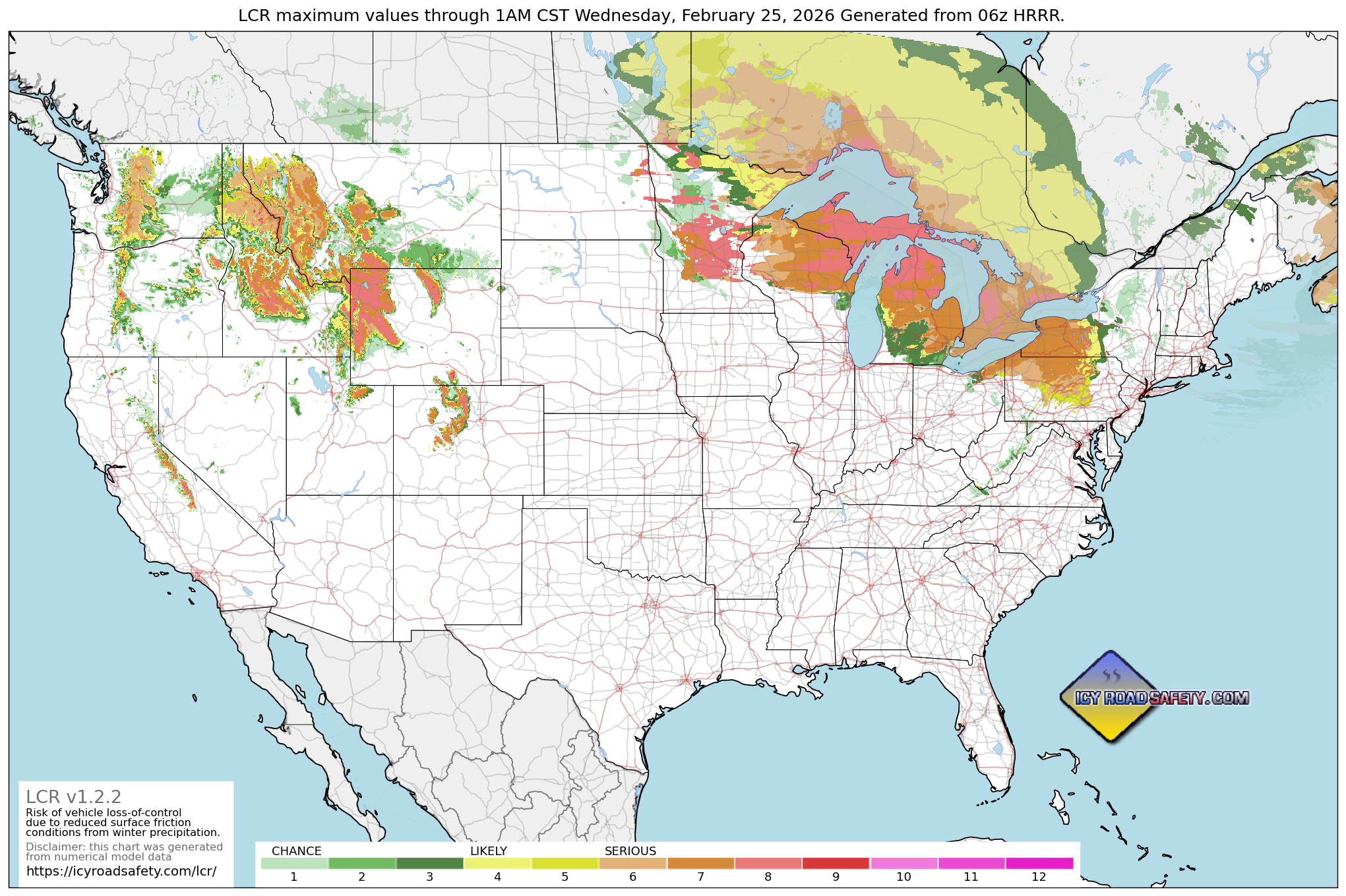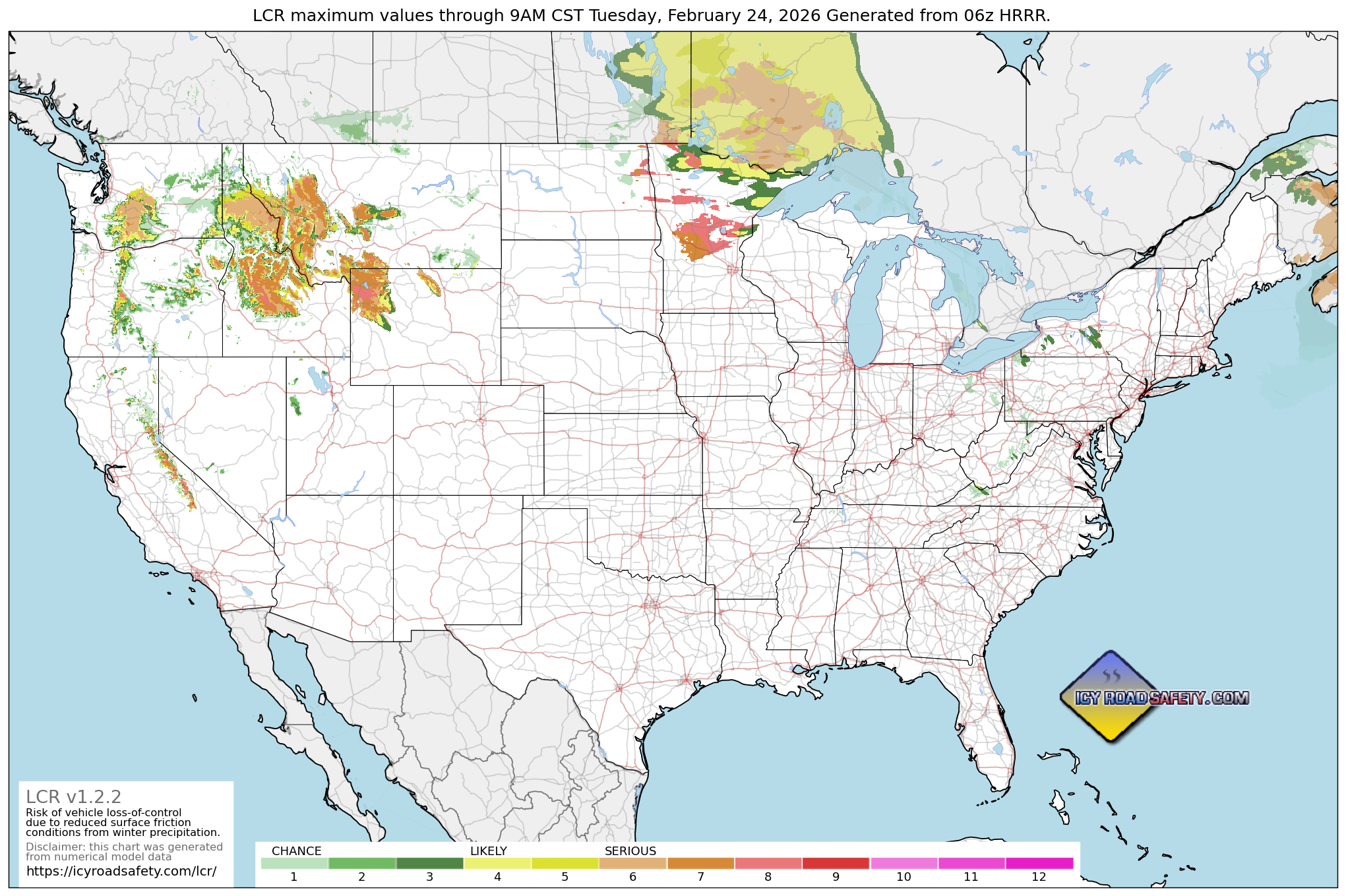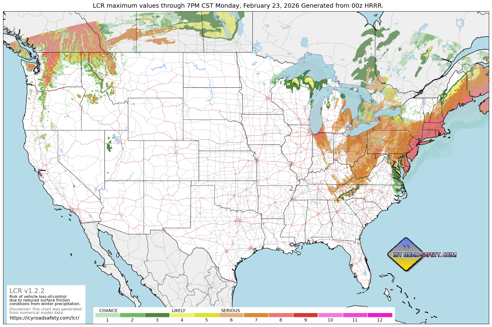 If your area is shown in a LCR risk area, it means the models are plotting conditions favorable for icy roads if the forecasted precipitation actually does occur.