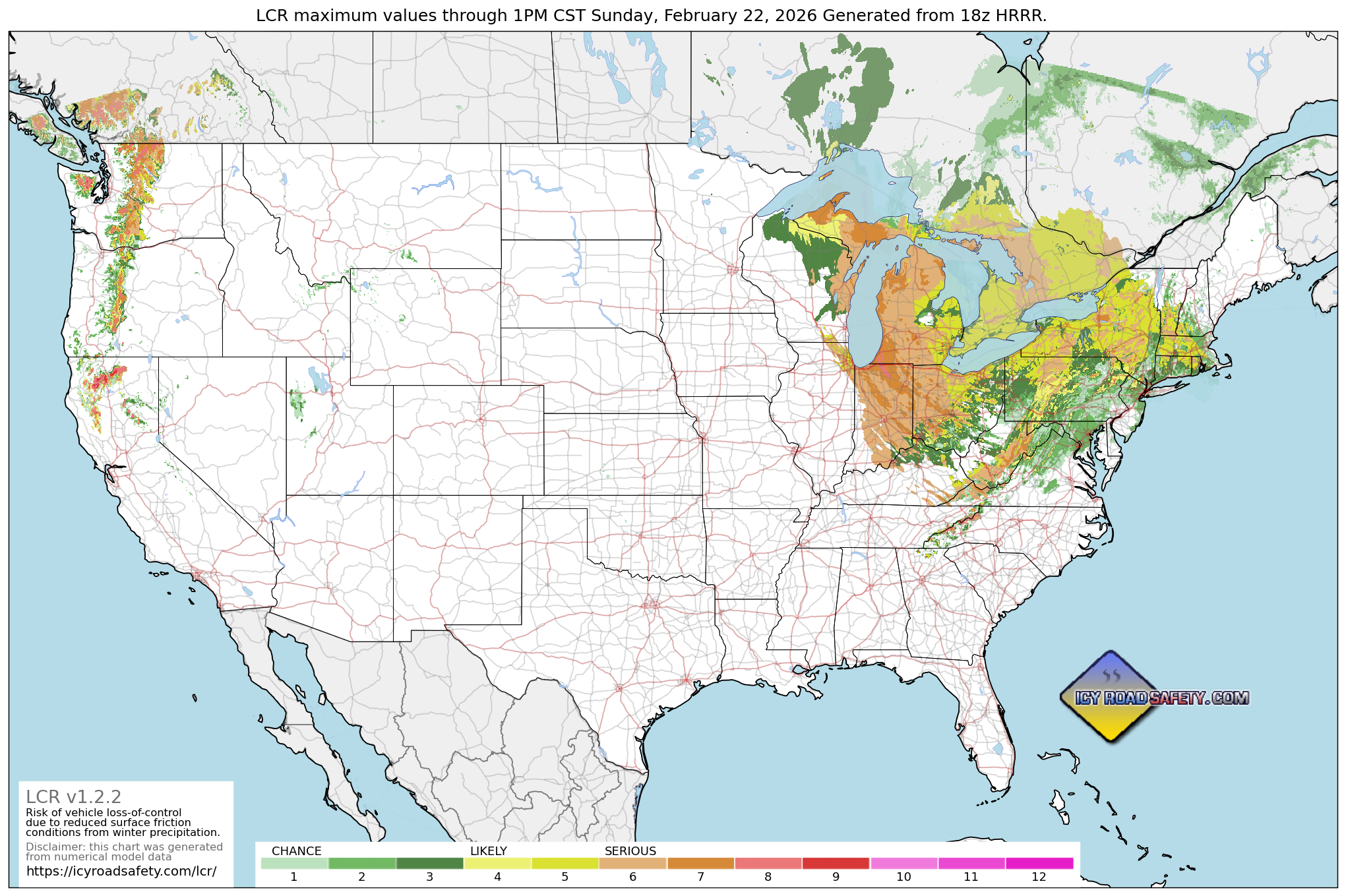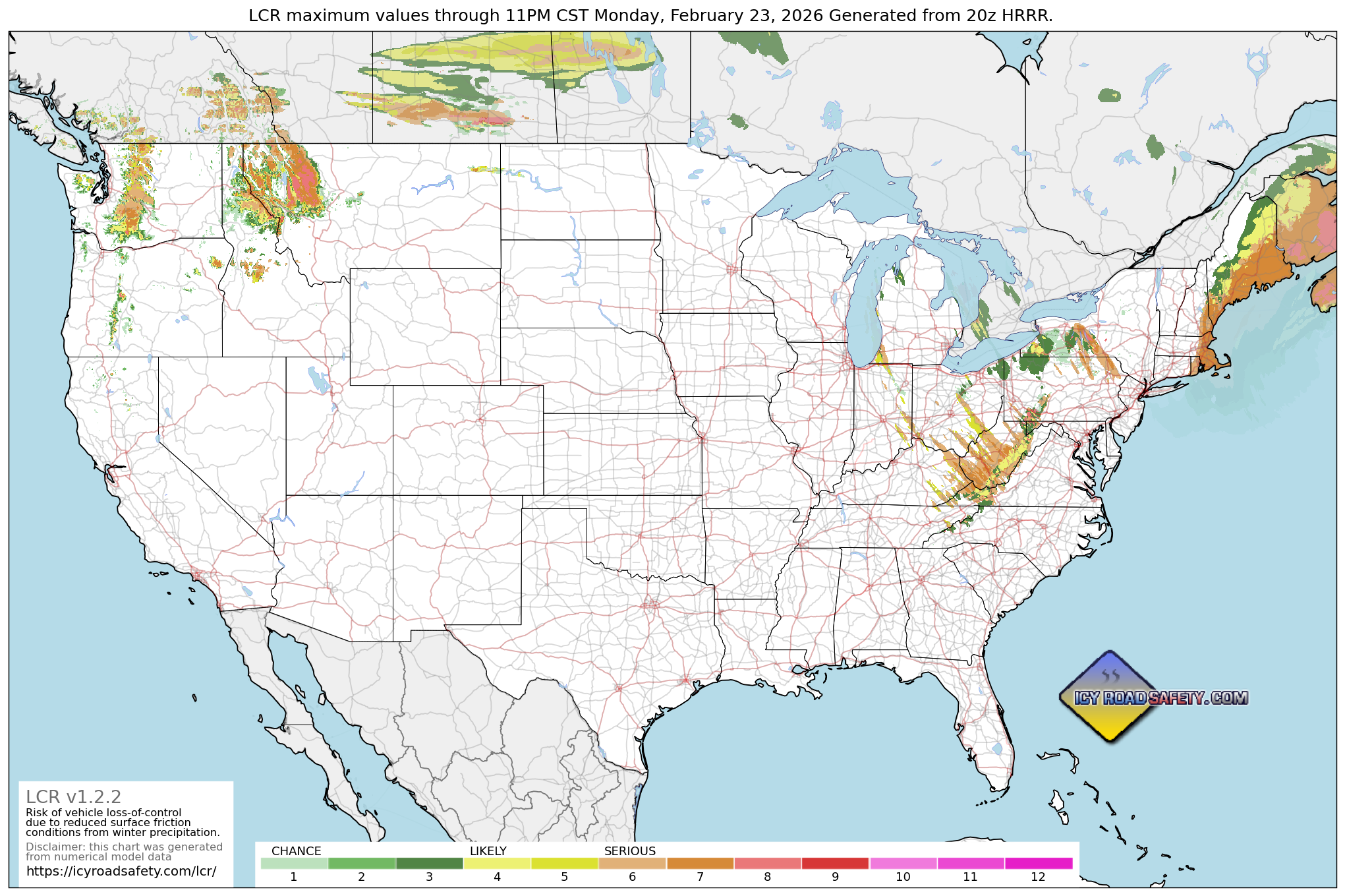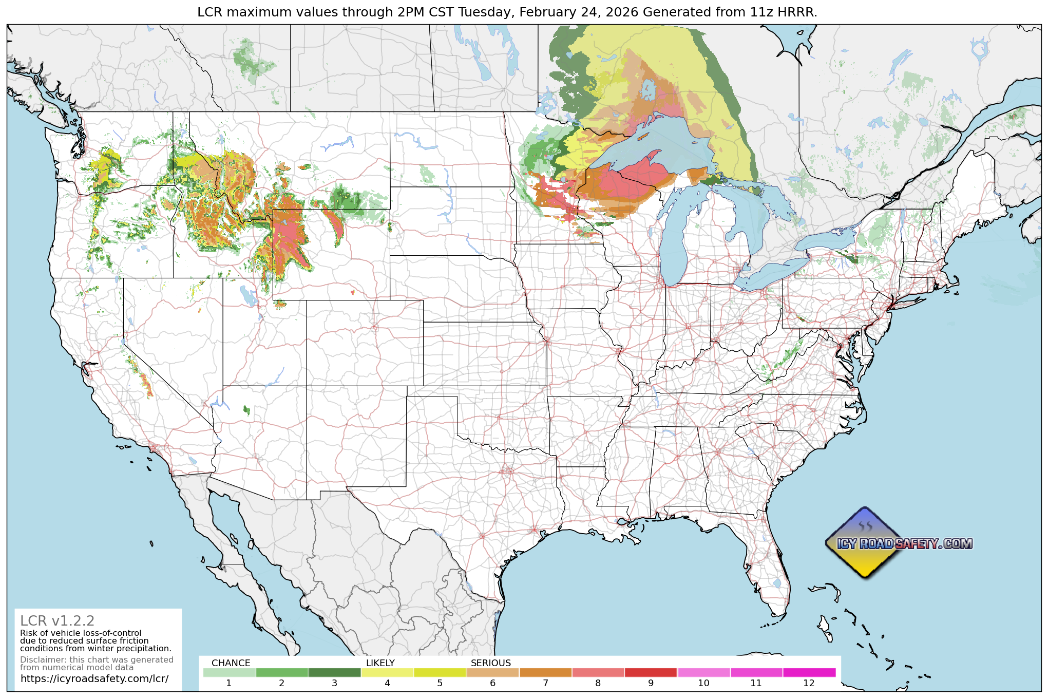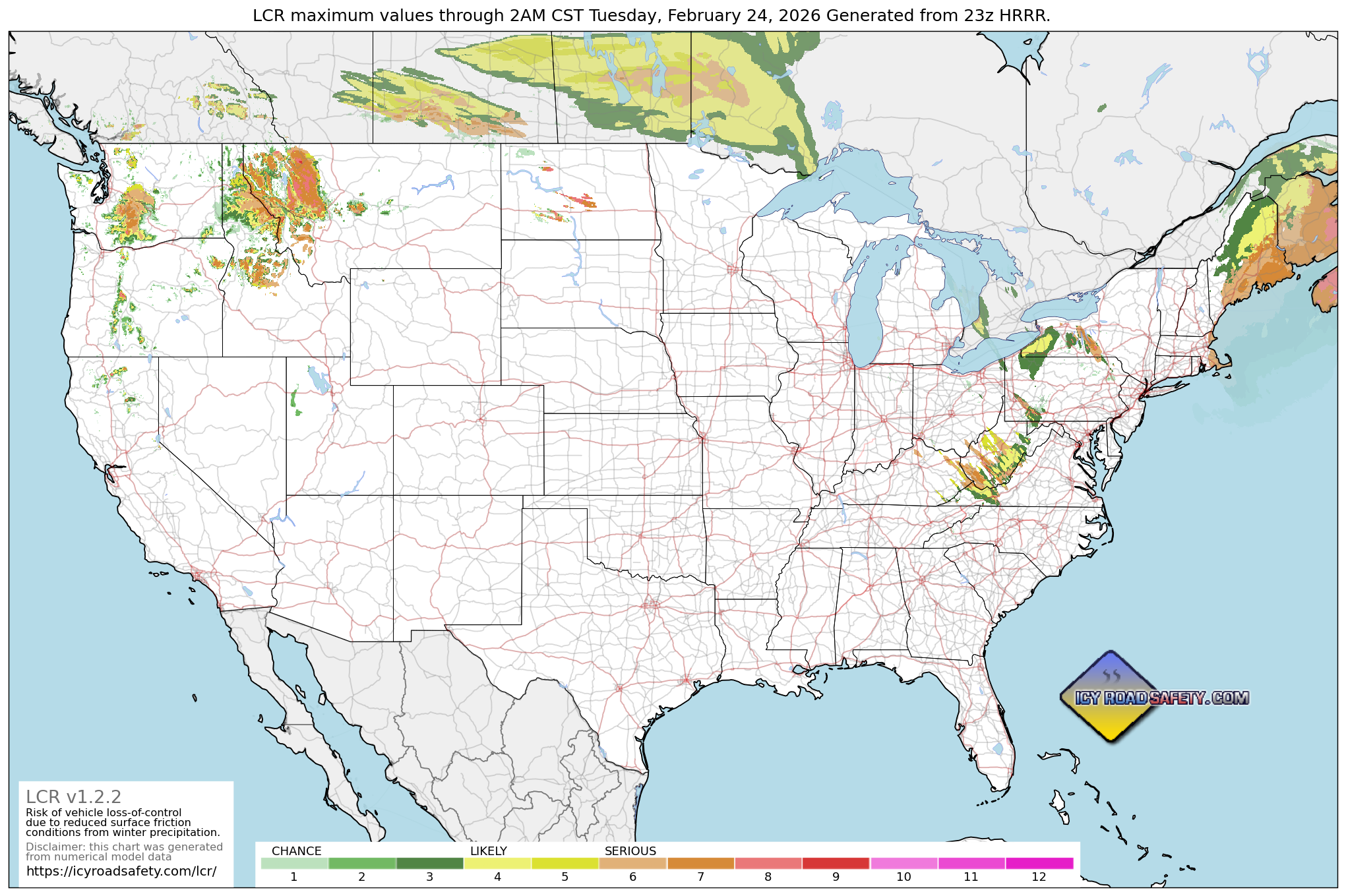 If your area is shown in a LCR risk area, it means the models are plotting conditions favorable for icy roads if the forecasted precipitation actually does occur.